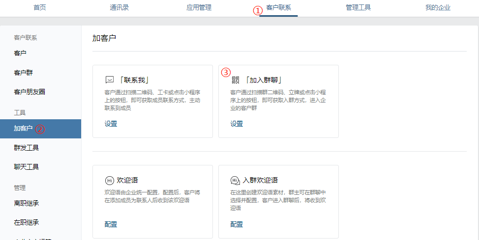 方式一:管理员登录企业微信管理后台,点击【客户联系】-【加客户】-【加入群聊】。
