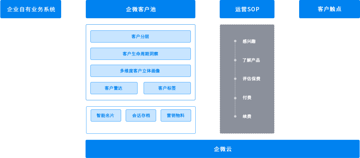 相较于传统险企,互联网保险经纪公司的优势在于对接了大量的网销渠道,通过这些渠道低成本获得了大量的客户线索。遇到的挑战是如何在庞大的客户线索池中筛选出高意向客户。保险经纪公司根据自身业务流程使用企微云设计好SOP标准转化流程,系统就会自动执行SOP计划进行客户的筛选与孵化,为业务顾问筛选出优质的客户线索,提高跟进效率