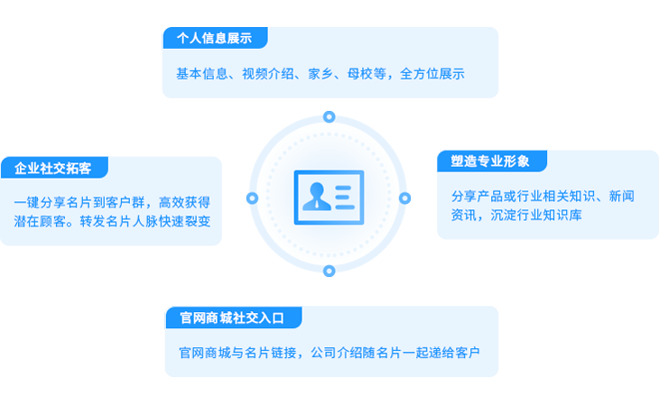 在B2B销售场景中,销售人员给客户的第一印象很重要。通过企微云智能名片丰富的展示组件搭建个人职业主页,全方位展示个人信息,给客户带来良好的第一印象。销售人员还可通过分享与自身产品或行业相关的新闻资讯、行业知识、行业方案文档等内容,逐步打造自己的专业形象,通过朋友圈分享励志海报打造积极的正能量人设,快速提高客户信任感
