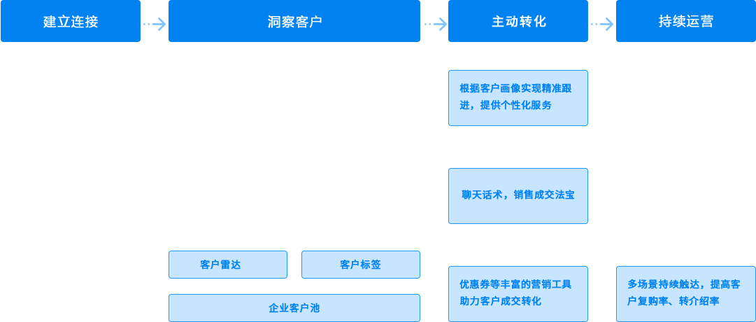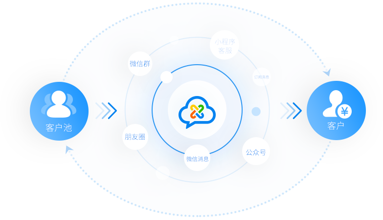 在建立企业客户池后,借助企微云可通过微信朋友圈、微信消息、微信群、公众号、小程序客服、订阅消息等触点持续与客户进行互动,持续为客户带来价值,激活潜在商机进行商机培育,激励老客户的分享转发带来更多优质商机,降低企业获客成本
